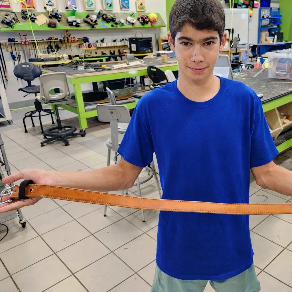 Students learn to cut patterns, punch holes, set hardware, and burnish edges while exploring different types of leather. They also use digital design and laser engraving in the Fab Lab to add custom markings and patterns.